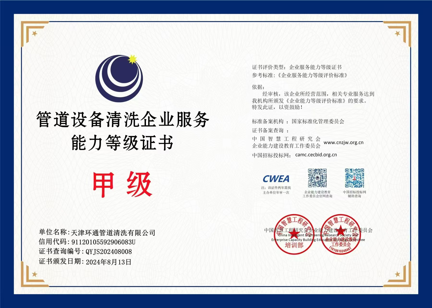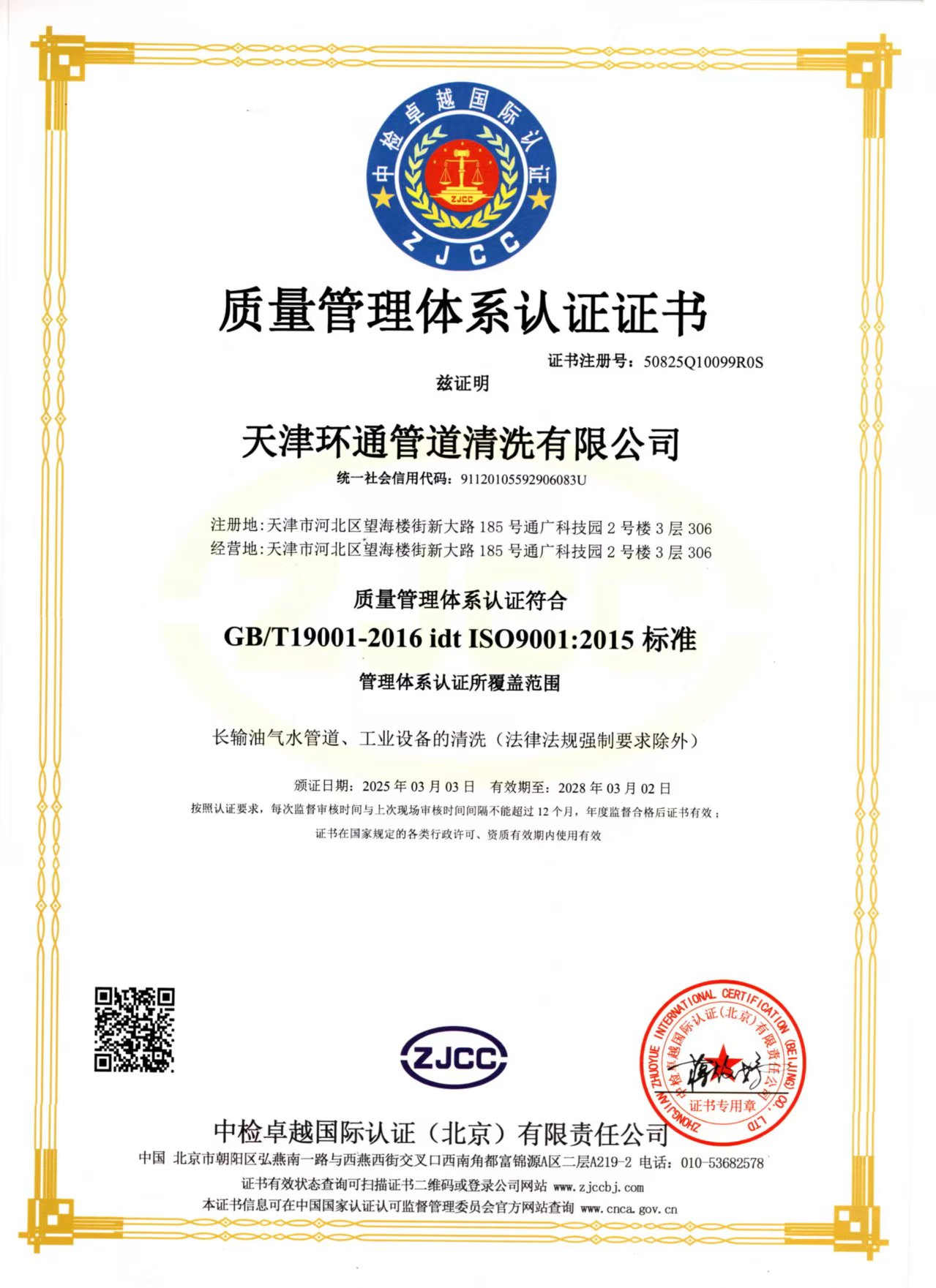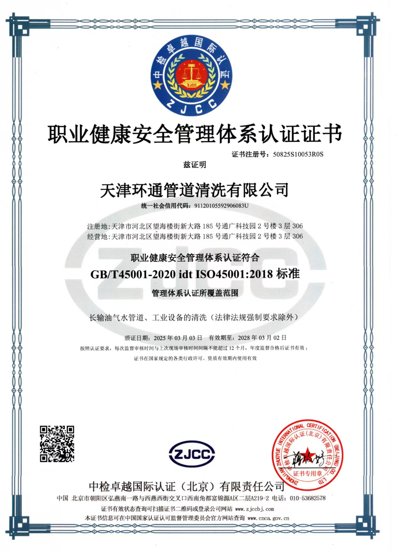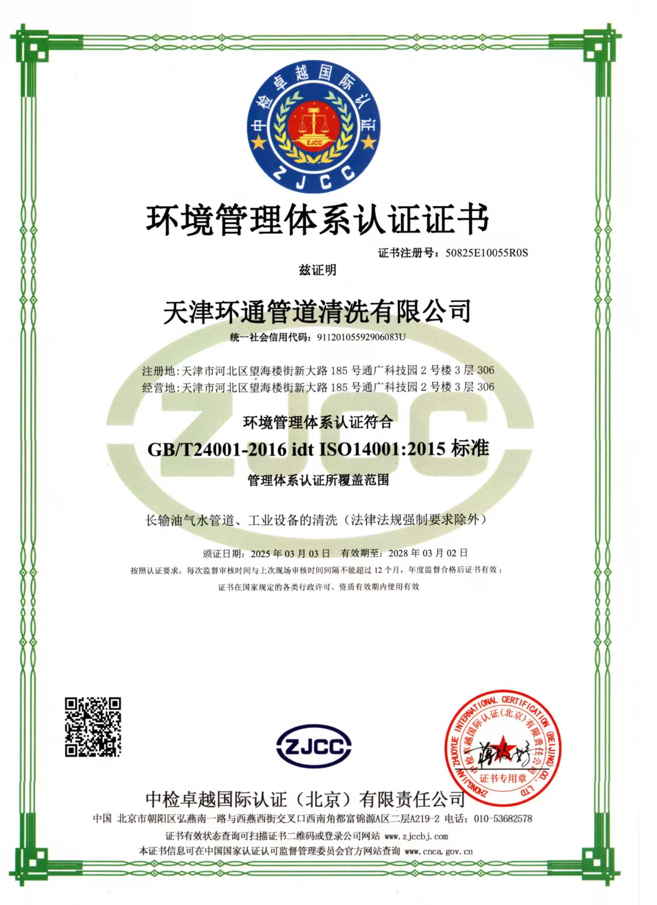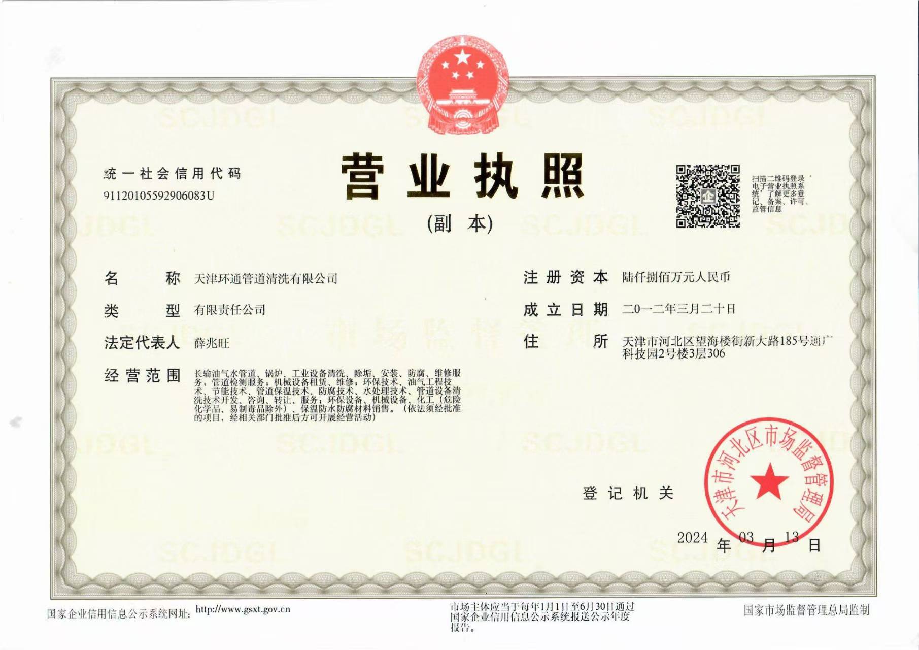 天津环通管道清洗有限公司成立于2012年,注册资金6800万元,公司拥有自主研发团队,其中博士后1名,硕士1名,学士3名,配有物理研发实验室、化学研发实验室、水质检测实验室各一所;共有员工68名,其中高级工程师1名,中级工程师2名,技术骨干18名。